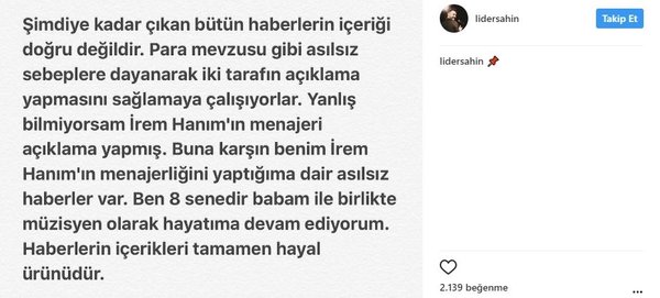 Dün de İrem Derici ve Lider Şahin ayrılığı hakkında `Para yüzünden ayrıldılar` şeklinde iddialar ortaya atılmıştı. Ancak Lider Şahin Instagram hesabından bir paylaşım yaparak `Para yüzünden ayrıldılar` iddialarını yalanladı.