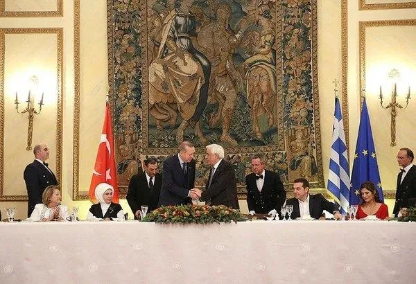 Erdoğan ve eşi Emine Erdoğan`a, yemeğin verildiği salona gelişlerinde Yunanistan Cumhurbaşkanı Pavlopoulos ve eşi Vlasia Pavlopoulos eşlik etti.