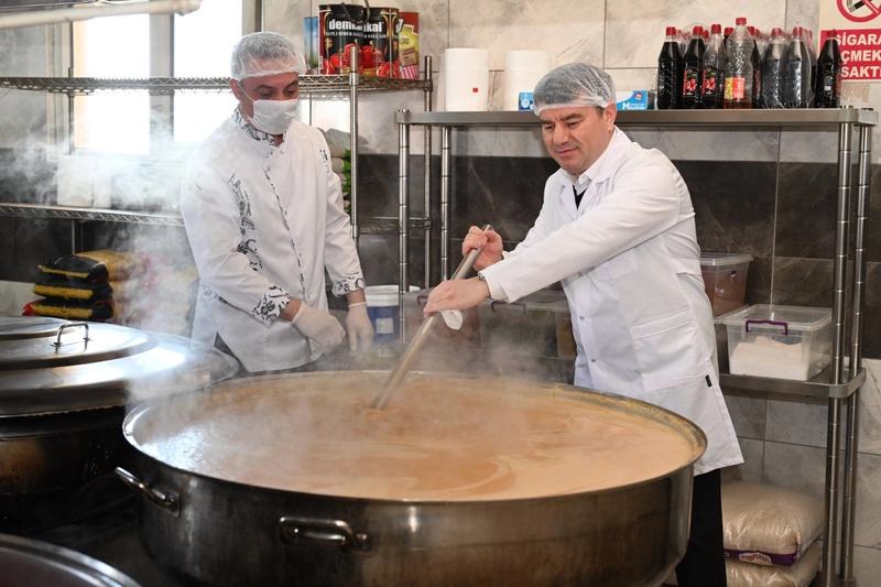 Başkan Dinçer, iftar hazırlıklarının yapıldığı mutfağı ziyaret ederek çalışmalar hakkında bilgi aldı. Önlüğünü giyip yemek karıştıran Dinçer, hazırlık sürecine katkıda bulundu ve personele kolaylıklar diledi.