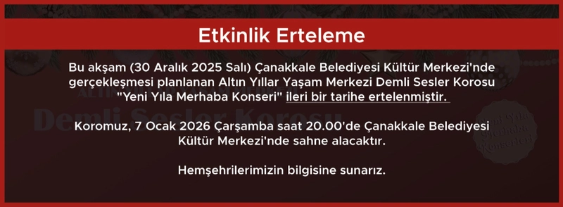 Altın Yıllar Yaşam Merkezi Demli Sesler Korosu'nun "Yeni Yıla Merhaba Konseri" ileri bir tarihe ertelendi. Konserin, bu akşam (30 Aralık 2025 Salı) Çanakkale Belediyesi Kültür Merkezi'nde gerçekleşmesi planlanıyordu.