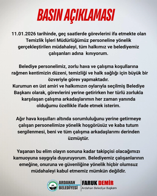 Ardahan Belediye Başkanı Faruk Demir, belediye çalışanlarına yönelik bir müdahale ile ilgili basın açıklaması yaptı. Demir, personelin zorlu hava ve çalışma koşullarına rağmen kentin temizliği, düzeni ve halk sağlığı için büyük özveriyle çalıştığını vurguladı.