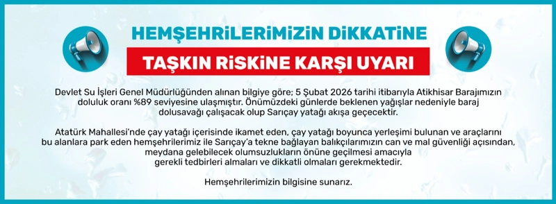 Atatürk Mahallesi'nde çay yatağı içinde ikamet eden, bu alanlarda yerleşimi bulunan veya araçlarını park eden vatandaşlar ile Sarıçay'a tekne bağlayan balıkçılar, can ve mal güvenlikleri açısından gerekli tedbirleri almak ve dikkatli olmak konusunda uyarıldı. Meydana gelebilecek olumsuzlukların önüne geçilmesi amaçlanıyor.