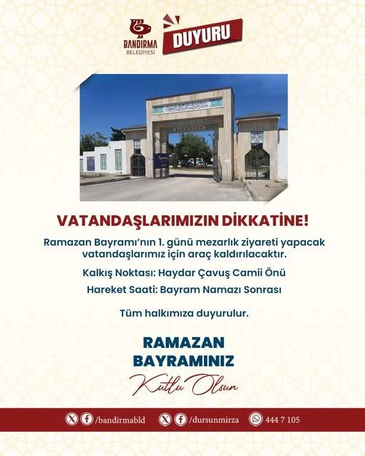 Bandırma Belediyesi, Ramazan Bayramı'nın birinci günü mezarlık ziyareti yapacak vatandaşlar için ücretsiz servis hizmeti başlatacağını duyurdu. Araçlar, Haydar Çavuş Camii önünden bayram namazının ardından hareket edecek.