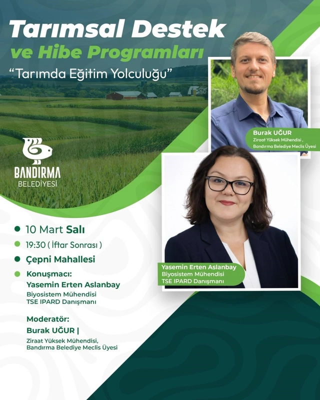 Toplantıda, Biyosistem Mühendisi ve TSE IPARD Danışmanı Yasemin Erten Aslanbay, 'Tarımsal Destek ve Hibe Programları' başlıklı bir sunum yapacak. Oturumun moderatörlüğünü ise Ziraat Yüksek Mühendisi ve Bandırma Belediye Meclis Üyesi Burak Uğur üstlenecek. Programda, üreticilerin yararlanabileceği destekler, fırsatlar ve yeni imkanlar ele alınacak.