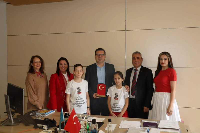 Arif Nihat Asya'nın "Bayrak" şiirini okuyan öğrenciler, yanlarında getirdikleri Türk bayrağını Başkan Yardımcısı Okan Şahin’e takdim etti.