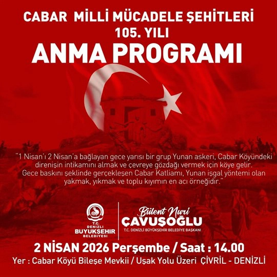 Denizli Büyükşehir Belediyesi, milli mücadele tarihinin en hüzünlü sayfalarından biri olan, Yunan işgal güçlerinin Çivril'in Cabar köyünde gerçekleştirdiği sivil katliamın 105. yıl dönümünde, Cabar şehitlerini düzenlenecek törenle anacak.