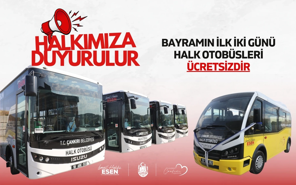 Çankırı Belediyesi, Ramazan Bayramı'nın birinci ve ikinci gününde şehir içi halk otobüslerini ücretsiz hale getirdi. Uygulama, 20-21 Mart tarihlerinde mevcut sefer planına uygun şekilde yürütülecek.