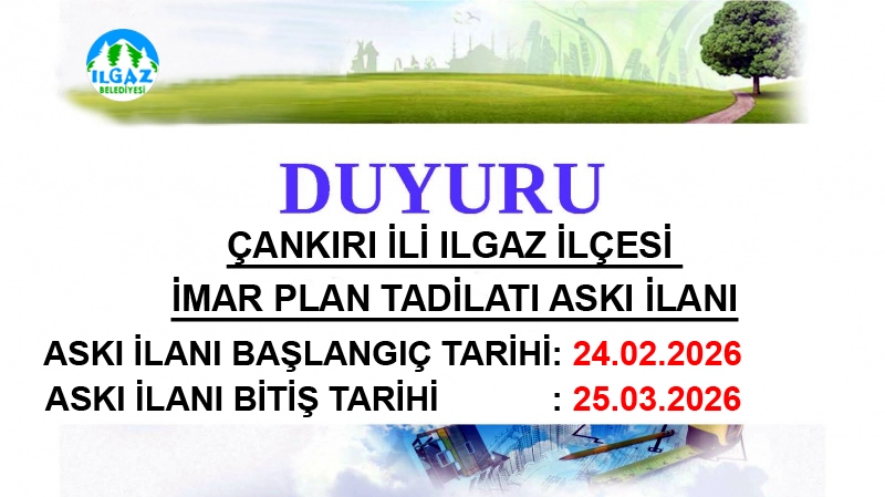 Çankırı'nın Ilgaz ilçesine bağlı Gazidede Mahallesi'nde, G31-A-08-D-2-B ve G31-A-08-D-2-C pafta numaralı alan için imar planı tadilatına ilişkin askı ilanı yayımlandı.