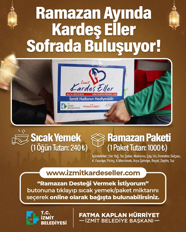 İzmit Belediyesi, Ramazan ayında ihtiyaç sahipleri için gıda kolisi ve sıcak yemek dağıtımı hazırlıklarını tamamlarken, hayırseverleri online bağış portalı üzerinden dayanışmaya katılmaya çağırdı.