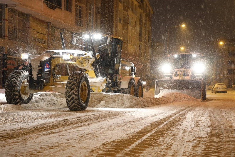 Ekipler, ana arterler başta olmak üzere tüm mahallelerde kar küreme ve tuzlama çalışmalarını 7/24 esasına göre sürdürüyor.