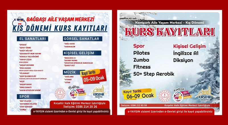 Kırşehir Belediyesi Bağbaşı Aile Yaşam Merkezi Kış Dönemi Kurs başvuruları 5 Ocak’ta başladı. Kentpark Aile Yaşam Merkezi kurs kayıtları ise 6 Ocak’ta başlıyor.