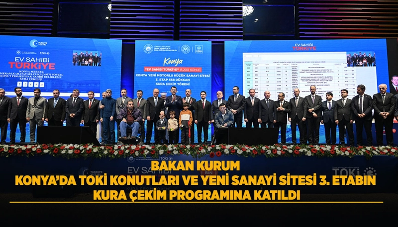 Çevre, Şehircilik ve İklim Değişikliği Bakanı Murat Kurum'un katılımıyla, "Yüzyılın Konut Projesi" kapsamında Konya'da yapılacak 15 bin 200 konut ile Yeni Motorlu Küçük Sanayi Sitesi 3. Etabı'ndaki 568 dükkanın kura çekim töreni gerçekleştirildi.