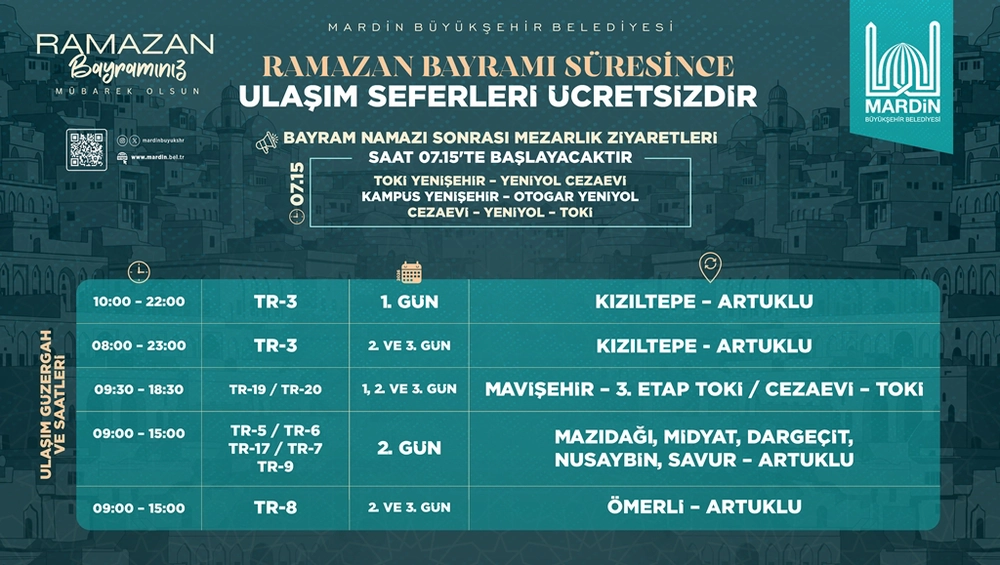 Mardin Belediyesi, Ramazan Bayramı süresince şehir içi toplu ulaşım hizmetlerinden ücretsiz yararlanılabileceğini duyurdu.