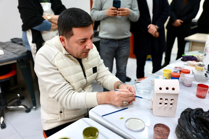 Belediye Başkanı Rasim Arı, Kadın Çalışmaları Eğitim Merkezi'nin düzenlediği el yapımı seramik mumluk boyama etkinliğinde yer aldı ve yetkililerden çalışmalar hakkında bilgi aldı.