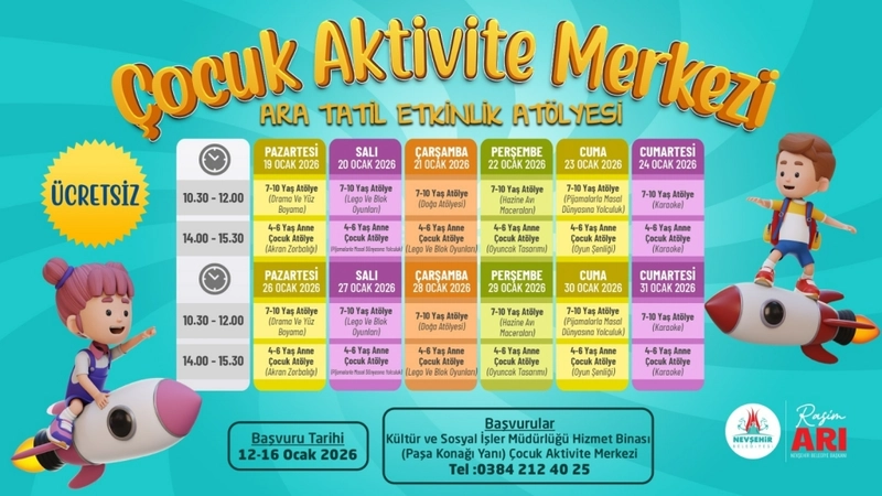 Çocuk Aktivite Merkezi tarafından "Ara Tatil Etkinlik Atölyesi" adıyla düzenlenecek program, 19-31 Ocak 2026 tarihleri arasında yapılacak.