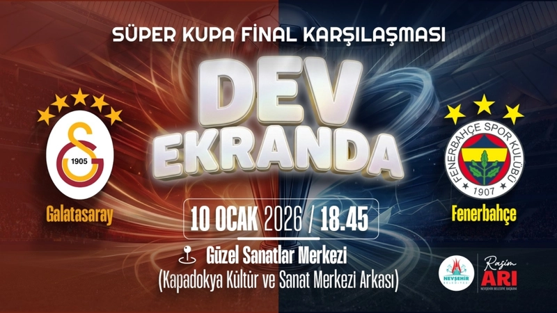 Nevşehir Belediyesi, Galatasaray ile Fenerbahçe arasında oynanacak Süper Kupa finali için şehir merkezinde dev ekran kuracak. Maç, 10 Ocak Cumartesi günü halka açık ve ücretsiz olarak yayınlanacak.