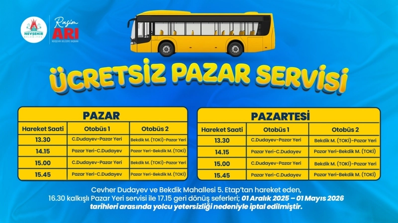 Nevşehir Belediye Başkanı Rasim Arı'nın talimatıyla 2025 yılı başında hizmete giren ücretsiz pazar servisi, vatandaşlar tarafından takdirle karşılanıyor. Uygulama, pazaryerinden evlere ücretsiz ulaşım imkanı sunuyor.