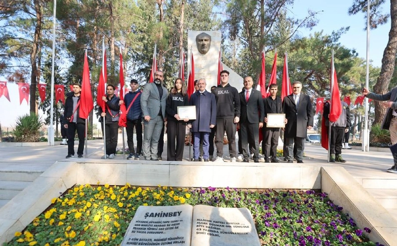Kırkayak Parkı'ndaki törenin ardından anma programı, Kilis yolu üzerindeki Şahinbey'in anıt mezarında devam etti. Antep Savunması'nda şehit düşen Şahin Bey, mezarı başında anıldı. Şahinbey Kaymakamı Mehmet Emin Taşçı ve Belediye Başkanı Mehmet Tahmazoğlu, anıt mezara çiçek bıraktı. Törende, Şahinbey Belediyesi'nin düzenlediği etkinliklerde dereceye giren öğrenciler şiir okudu.