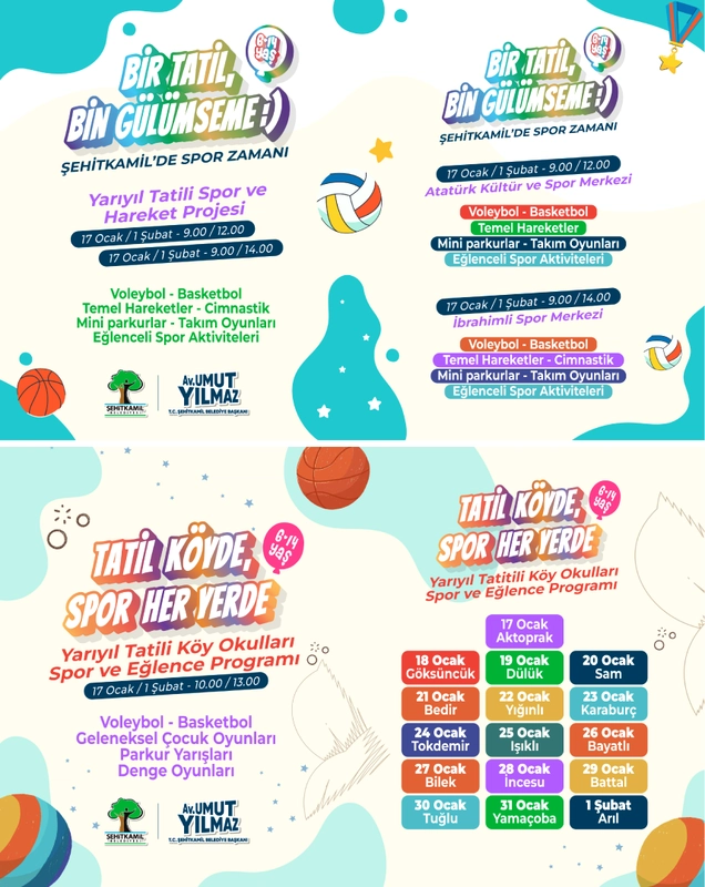 Şehitkamil Belediyesi, yarıyıl tatilinde ilçe genelinde çocuklara yönelik kapsamlı spor ve eğlence programı başlattı. Etkinlikler, 17 Ocak-1 Şubat tarihleri arasında hem kırsal mahallelerde hem de kent merkezindeki spor merkezleri