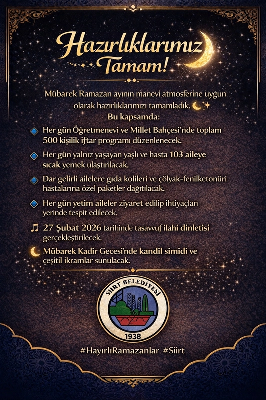 Siirt Belediyesi, Ramazan ayı için yapılan hazırlıkların tamamlandığını duyurdu. Vali ve Belediye Başkan Vekili Dr. Kemal Kızılkaya'nın talimatları doğrultusunda, Kültür ve Sosyal İşler Müdürlüğü koordinasyonunda geniş kapsamlı bir program hazırlandı.