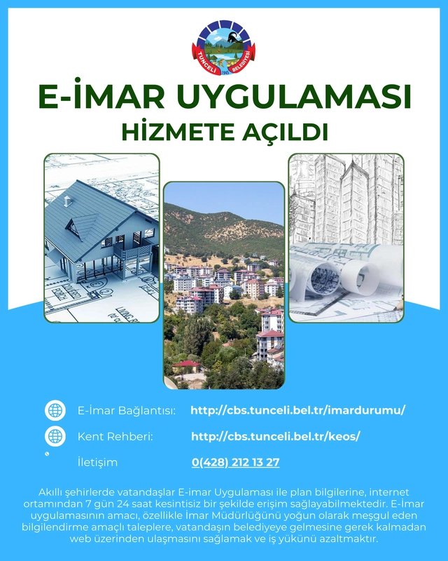 Tunceli Belediyesi, vatandaşların parsel ve plan bilgilerine internet üzerinden 7/24 erişim sağlayabilmesi için E-İmar uygulamasını hayata geçirdi. Uygulama, İmar Müdürlüğü'nün iş yükünü hafifletmeyi amaçlıyor.