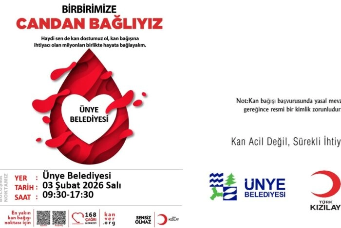 Ünye Belediyesi ve Türk Kızılay iş birliğiyle 3 Şubat 2026 Salı günü kan bağışı kampanyası gerçekleştirilecek. Kampanya, belediye binasında 09.30 ile 17.30 saatleri arasında yapılacak.