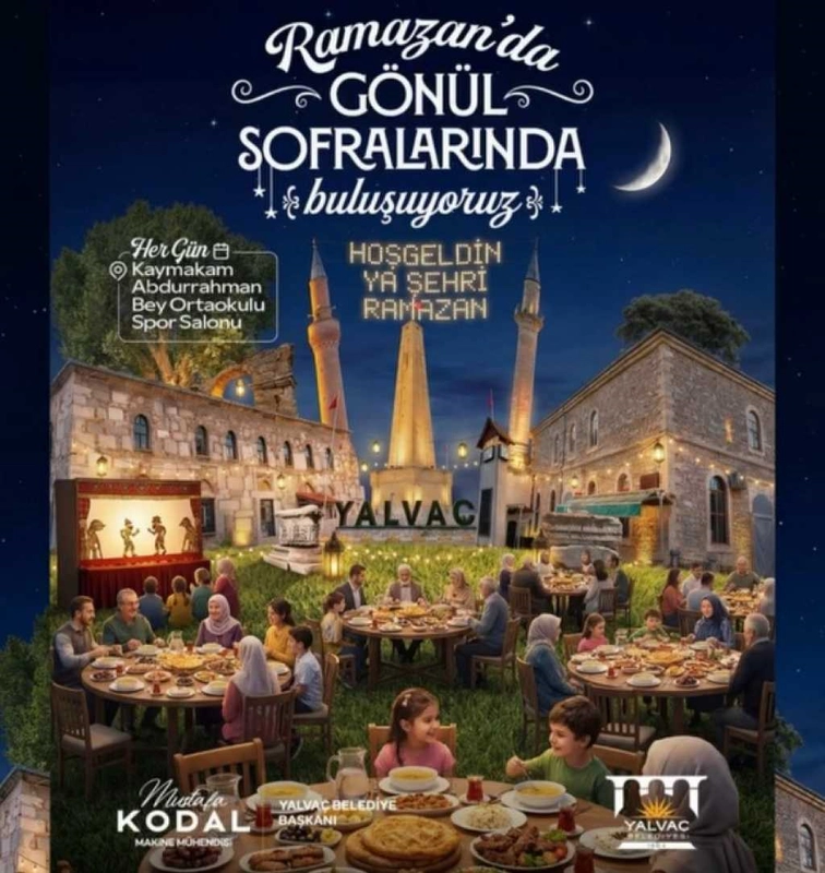 Yalvaç Belediyesi, Ramazan ayı boyunca her gün halka ücretsiz iftar yemeği verecek. İftarlar, Kaymakam Abdurrahman Bey Ortaokulu Spor Salonu'nda gerçekleştirilecek.