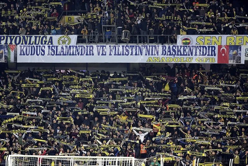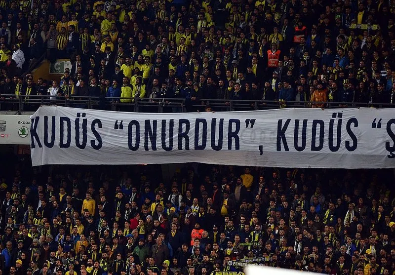 Migros Tribünü`nde sarı-lacivertli taraftarlar, "Kudüs İslamındır ve Filistin`in Başkentidir" yazılı büyük bir pankart açtı.