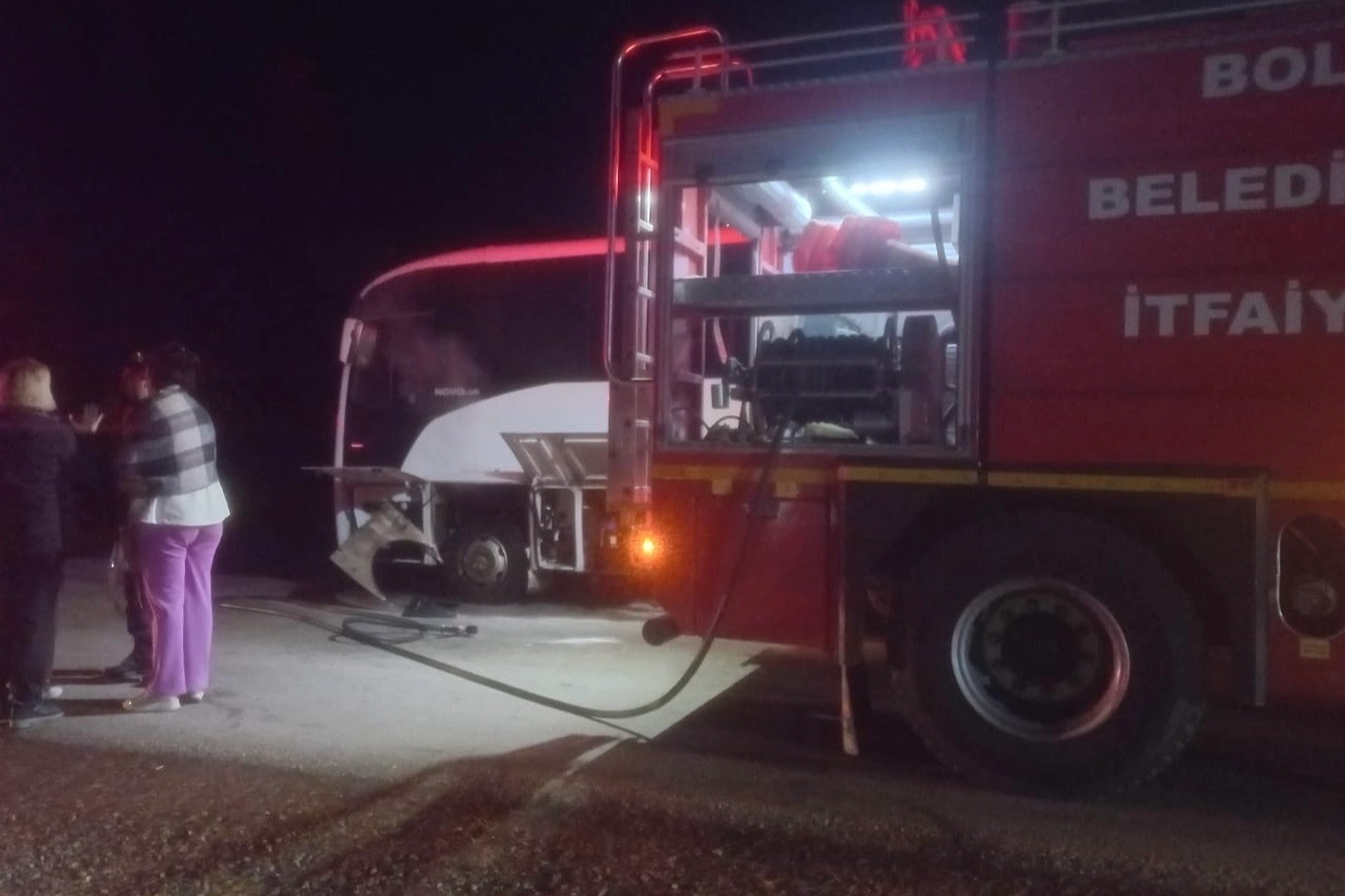 Bolu'nun Yedigöller Milli Parkı yolunda seyir halindeyken motor kısmı alev alan yolcu otobüsünde, rehber Ahmet Alkan'ın hızlı müdahalesi olası bir faciayı önledi.