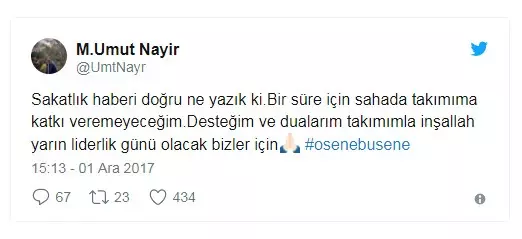 11 MAÇTA 6 GOL ATTI Teknik direktörlüğünü İsmail Kartal`ın yaptığı Ankaragücü`nde golcü Umut Nayır, 11 maçta 6 gol kaydetmişti... Genç golcü sakatlık haberini böyle duyurdu;