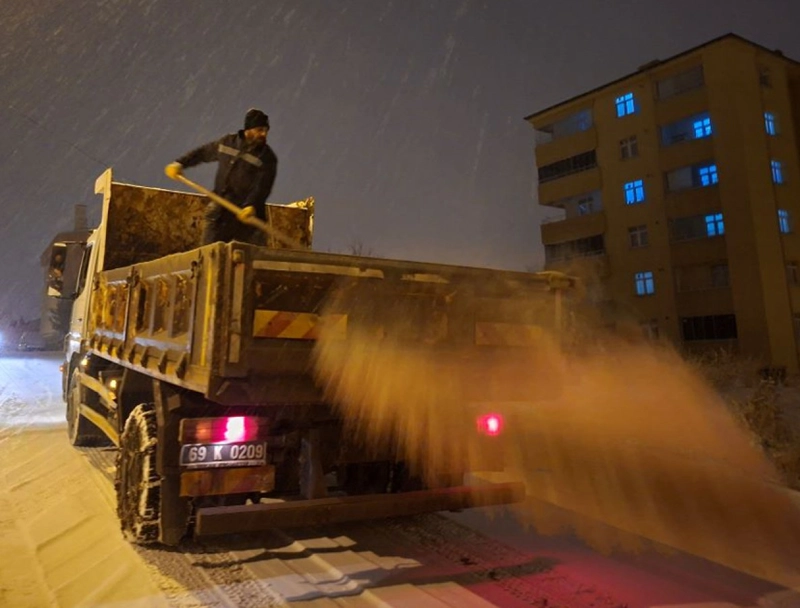 Bayburt'ta etkili olan kar yağışı sonrası belediye ekipleri, ulaşımın aksamaması ve vatandaş güvenliği için aralıksız çalışıyor. Ana arterlerden ara sokaklara kadar kapsamlı temizlik ve tuzlama faaliyetleri sürdürülüyor.