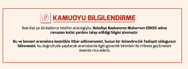 Telefonla yapılan ve Belediye Başkanı Muharrem Erkek adına ramazan koli yardımı talep eden aramaların dolandırıcılık olduğu bildirildi. Vatandaşların bu aramalara itibar etmemesi ve güvenlik birimlerine başvurması istendi.