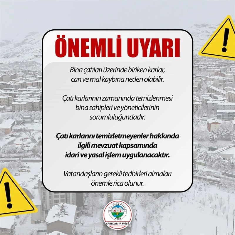 Çatı karlarının zamanında ve güvenli bir şekilde temizlenmesi sorumluluğunun, bina sahipleri ve yöneticilerine ait olduğu vurgulandı. İlgili mevzuat gereği bu görevin yerine getirilmesi zorunlu tutuluyor.