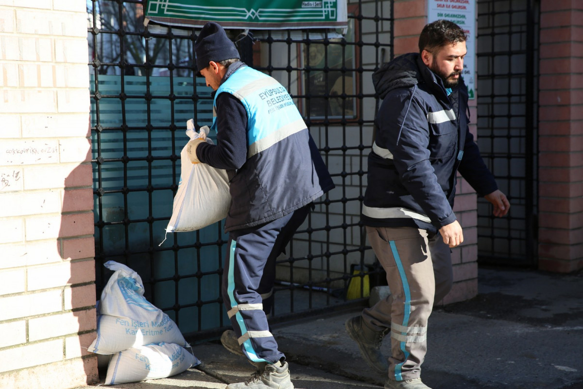 Fen İşleri Müdürlüğü ekipleri tarafından ilçe genelinde önleyici tedbirler de hayata geçirildi. Bu kapsamda kamu kurum ve kuruluşları, hastaneler, muhtarlıklar, okullar, aile sağlığı merkezleri ve camiler başta olmak üzere vatandaşların yoğun olarak kullandığı alanlara tuz çuvalları dağıtıldı.