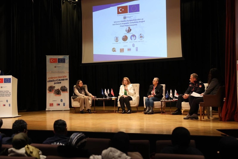 Eyüpsultan'da afetlere hazırlık, yerel kapasitenin güçlendirilmesi ve kurumlar arası iş birliğinin geliştirilmesi amacıyla düzenlenen \"Sıfırıncı Dakika: Eyüpsultan Afet ve Acil Durum Kapasite Geliştirme Projesi\" final organizasyonu gerçekleştirildi.