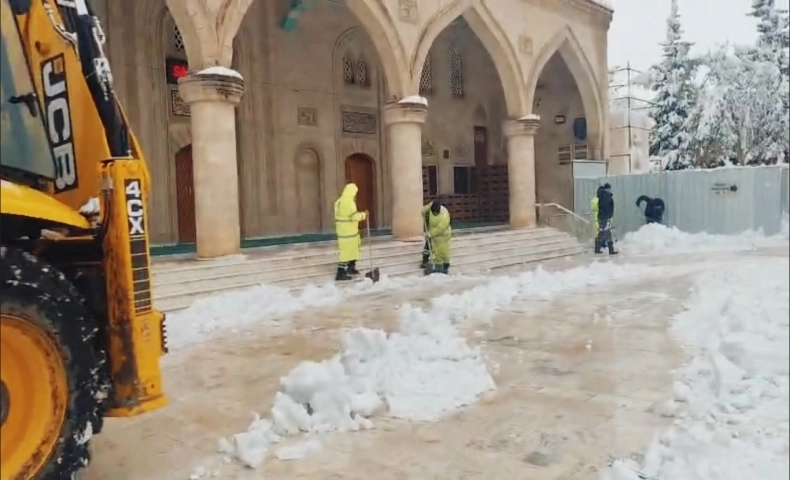 Yüzlerce personel ve iş makinesi ile sahada konuşlanan ekipler, ilçedeki büyük camilerin önlerini ve çevresini kardan arındırdı. Cuma namazına gidecek vatandaşların güvenli ulaşımını sağlamak amacıyla yapılan çalışmalar kapsamında, kaldırımlardaki karlar da kar kürekleriyle temizlenerek yaya yolları açıldı.