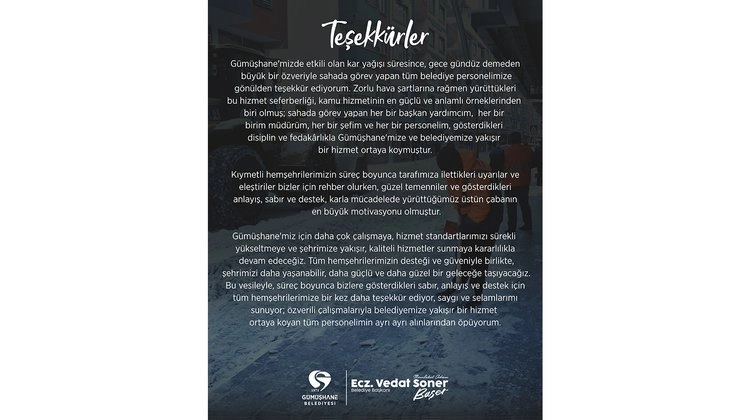 Gümüşhane Belediye Başkanı, kentte etkili olan kar yağışı süresince ulaşım ve temel hizmetlerin aksamaması için çalışan tüm belediye personeline teşekkürlerini iletti.