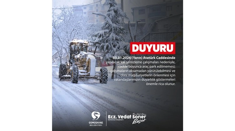 Gümüşhane Belediyesi, 2 Ocak 2026 tarihli bir duyuru yayımladı. Duyurunun içeriği kamuoyuyla paylaşıldı.