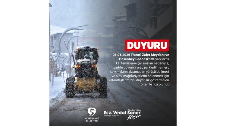 04 Ocak 2026, Pazar Gümüşhane Belediyesi, 4 Ocak 2026 Pazar gününe ait resmi bir duyuru yayımladı. Duyuru metni, belediyenin resmi iletişim kanalları üzerinden paylaşıldı. Gümüşhane,Gümüşhane Belediyesibelediye365.com