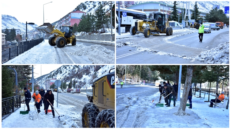 Gümüşhane Belediyesi ekipleri, il genelinde etkili olan kış şartları nedeniyle kar ve buz temizleme çalışmalarını kesintisiz olarak sürdürüyor.