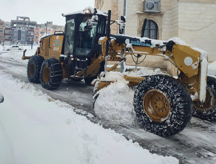 Şanlıurfa'nın Haliliye ilçesinde etkili olan kar yağışı nedeniyle belediye ekipleri, ulaşımın aksamaması ve vatandaşların mağdur olmaması için dört koldan çalışma yürütüyor.