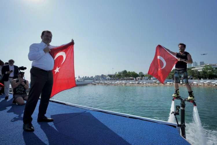 İSTANBUL (İGFA) - İBB İtfaiyesi’nin arama kurtarma ekibi, suyun altına bu kez Ay Yıldızlı Türk Bayrağı açmak için daldı. Sahili dolduran İstanbullular bu etkileyici anı kurulan ekrandan canlı olarak izledi. Dünya backflip rekortmeni Kahraman Aktaş’ın yer çekimine meydan okuyan flyboard gösterisi heyecanlı gözlerle takip edildi. Türkiye’nin en geleneksel mücadelelerinden biri olan yağlı direk yarışlarında ise rekabet üst düzeydeydi. Rakiplerini geride bırakarak direğin ucundaki bayrağa ulaşan yarışmacı tam altın ile ödüllendirildi.