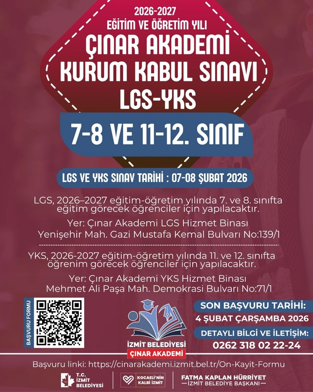 İzmit Belediyesi Çınar Akademi, eğitimde fırsat eşitliği ve nitelikli öğretim hedefiyle çalışmalarını sürdürüyor. Kurum, 2026-2027 eğitim öğretim yılı için öğrenci kabul sınavını 7-8 Şubat tarihlerinde gerçekleştirecek.