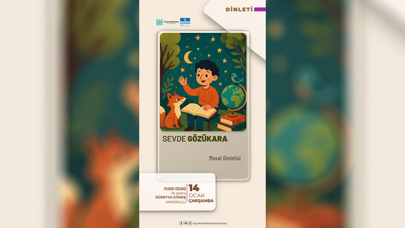 Kahramanmaraş Büyükşehir Belediyesi, çocuk edebiyatı yazarı Sevde Gözükara'nın katılımıyla 14 Ocak Çarşamba günü Onikişubat Süreyya Güneş Anaokulu'nda masal dinletisi düzenleyecek. Programda Gözükara, eğlenceli ve öğretici masallarını çocuklarla paylaşacak.
