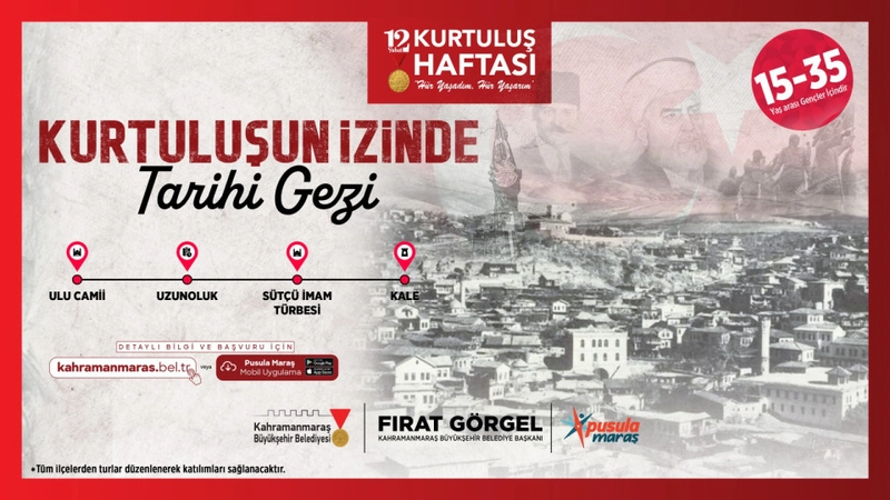 Kahramanmaraş Büyükşehir Belediyesi, 12 Şubat Kurtuluş Haftası kapsamında 15-35 yaş arası gençlere yönelik tarihi mekân gezisi düzenleyecek. Başvurular belediyenin internet sitesinden alınıyor.