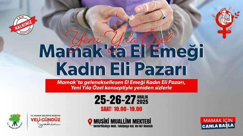 Mamak Belediyesi'nin kadınların ev ekonomilerine katkı sunması ve üretime katılımını artırmak amacıyla hayata geçirdiği pazar, 25, 26 ve 27 Aralık tarihlerinde açık kalacak. Musiki Muallim Mektebi'ndeki stantlar, saat 10.00 ile 19.00 arasında hizmet verecek. Yılbaşı hediyesi arayan vatandaşlar, yüzlerce farklı el emeği ürün seçeneğini burada bulabilecek.