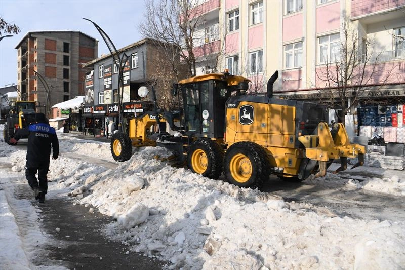 Muş Belediyesi ekipleri, kış şartları nedeniyle Muratpaşa ve Kültür mahallelerinde kar temizleme ve yükleme çalışmalarını aralıksız sürdürüyor.