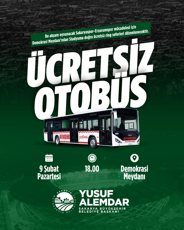 Belediye otobüsleri, 18.00 ile 20.00 saatleri arasında Demokrasi Meydanı’ndan stadyuma sürekli sefer düzenleyecek. Taraftarlar bu araçlarla ücretsiz taşınacak. Aynı uygulama maç sonrasında da stadyumdan Demokrasi Meydanı’na dönüş için geçerli olacak.